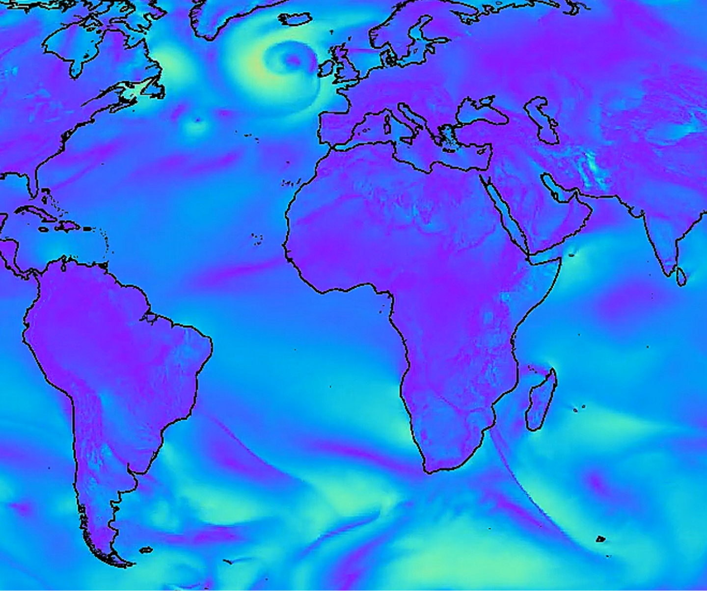A selection of GraphCast’s predictions rolling across 10 days showing specific humidity at 700 hectopascals (about 3 km above surface), surface temperature, and surface wind speed.