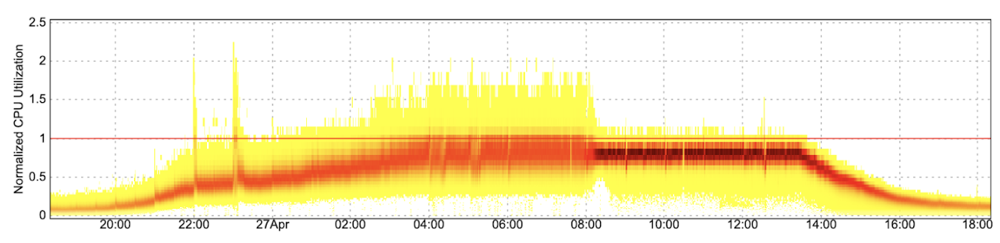 Heatmaps of normalized CPU usage transitioning to Prequal at 08:00.