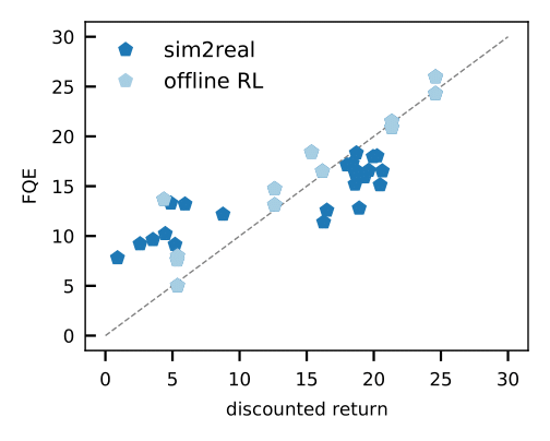FQE scores are well aligned with the ground truth performance of policies trained in both sim2real and offline RL setups.