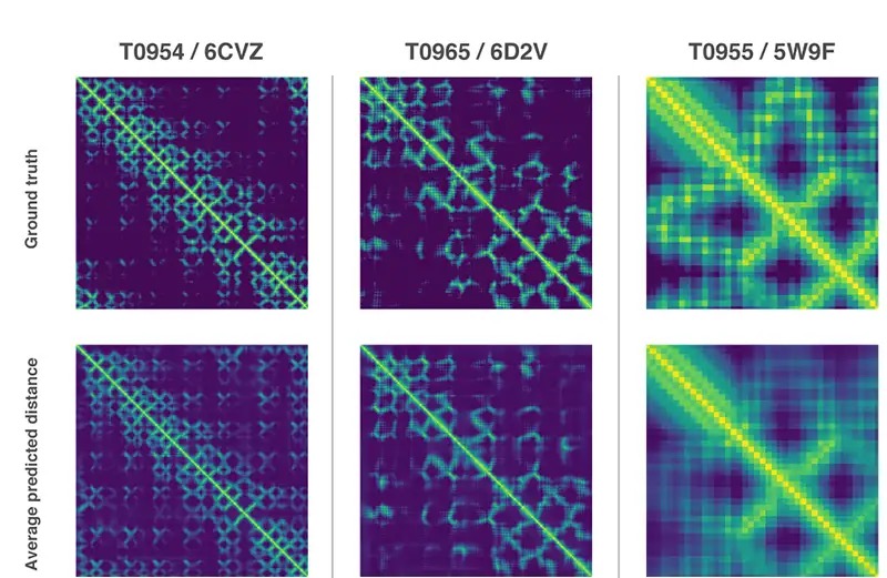 Both of these methods relied on deep neural networks that are trained to predict properties of the protein from its genetic sequence. The properties our networks predict are: (a) the distances between pairs of amino acids and (b) the angles between chemical bonds that connect those amino acids. The first development is an advance on commonly used techniques that estimate whether pairs of amino acids are near each other.