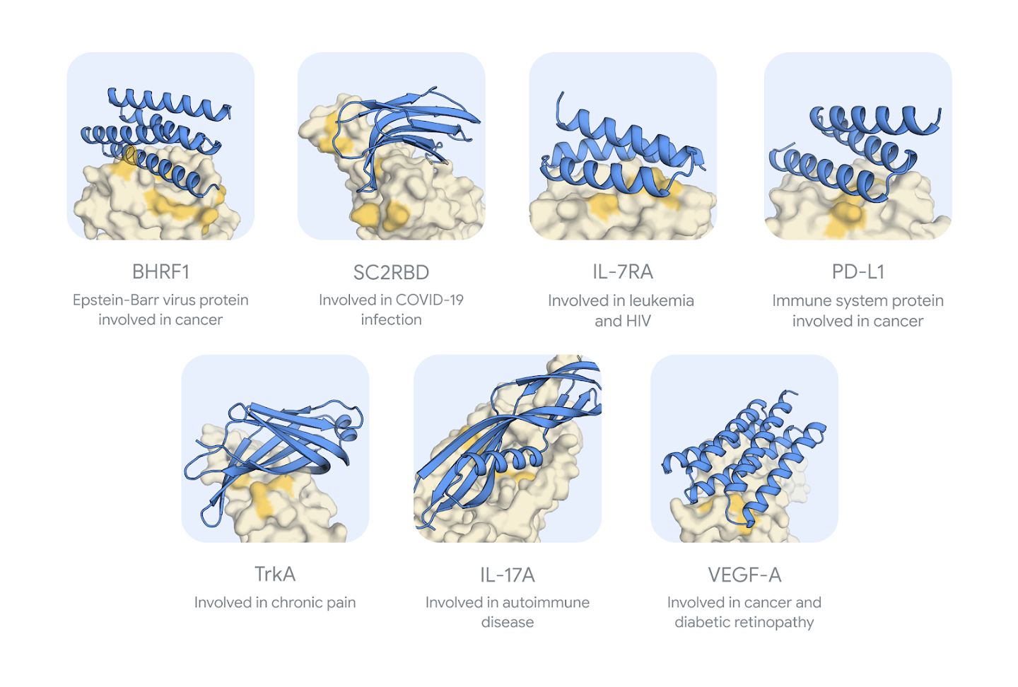 AlphaProteo can generate new protein binders for diverse target proteins, including VEGF-A, which is associated with cancer and complications from diabetes. This is the first time an AI tool has been able to design a successful protein binder for VEGF-A.