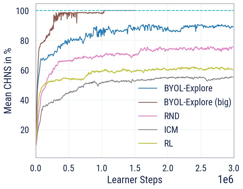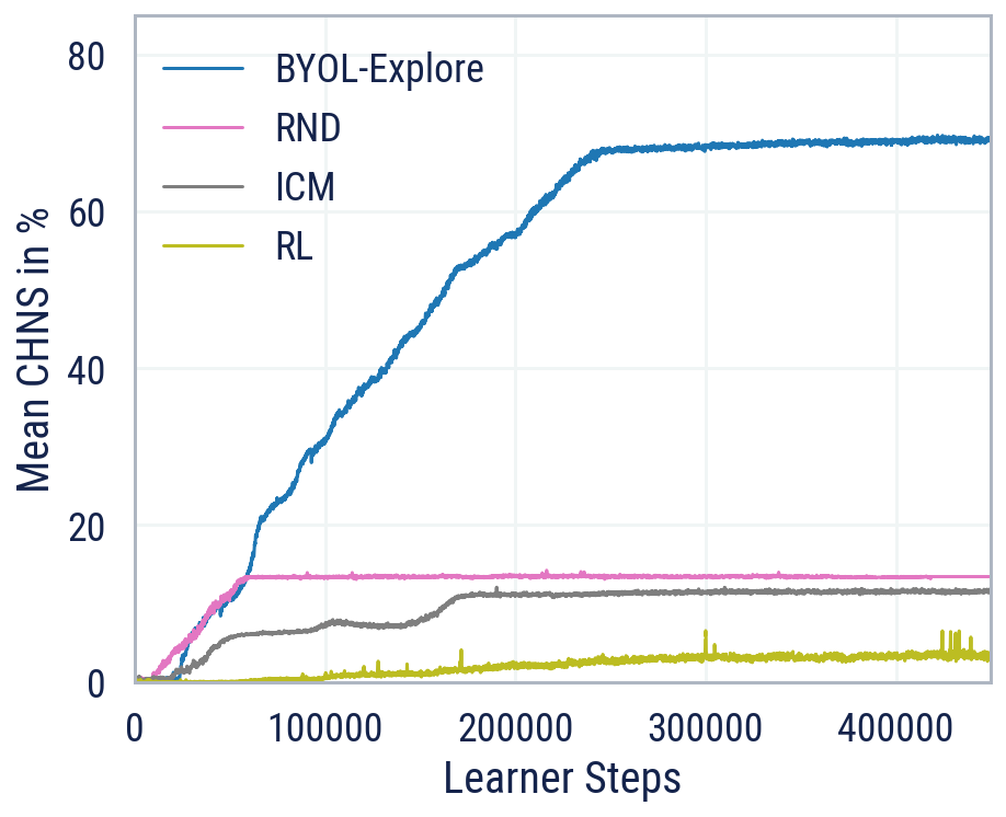 Comparison between BYOL-Explore, Random Network Distillation (RND), Intrinsic Curiosity Module (ICM) and pure RL (no intrinsic reward), in terms of mean capped human-normalised score (CHNS).