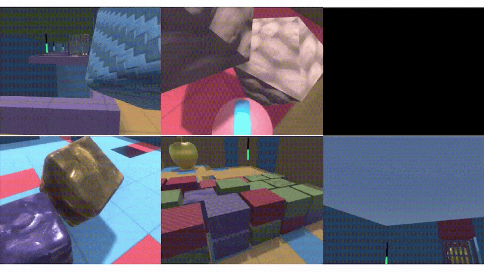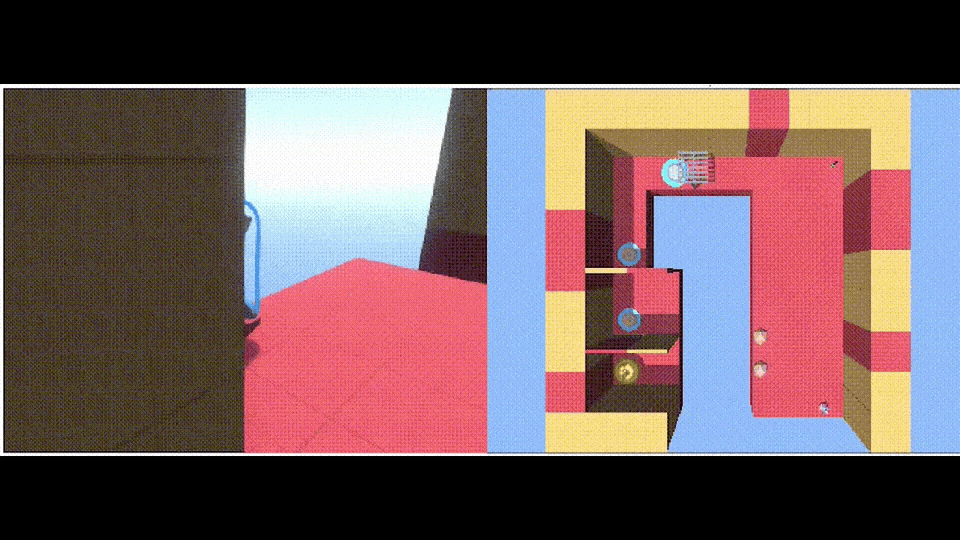 Second-person and top-down views of a BYOL-Explore agent solving Thow-Across level of DM-HARD-8, whereas pure RL and other baseline exploration methods fail to make any progress on Thow-Across.