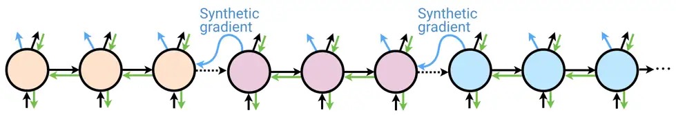 Using decoupled neural interfaces (DNI) therefore removes the locking of preceding modules to subsequent modules in a network. In experiments from the paper, we show we can train convolutional neural networks for CIFAR-10 image classification where every layer is decoupled using synthetic gradients to the same accuracy as using backpropagation. It’s important to recognise that DNI doesn’t magically allow networks to train without true gradient information. The true gradient information does percolate backwards through the network, but just slower and over many training iterations, through the losses of the synthetic gradient models. The synthetic gradient models approximate and smooth over the absence of true gradients.