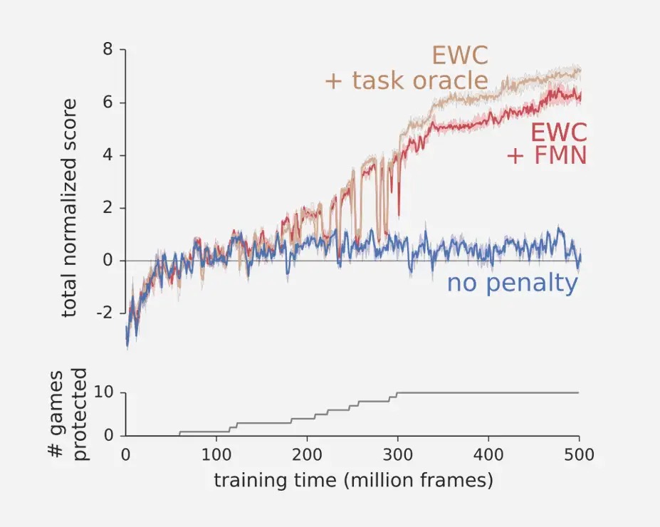 To test our algorithm, we exposed an agent to Atari games sequentially. Learning an individual game from the score alone is a challenging task, but learning multiple games sequentially is even more challenging as each game requires an individual strategy. As shown in the figure below, without EWC, the agent quickly forgets each game after it stops playing it (blue). This means that on average, the agent barely learns a single game. However, if we use EWC (brown and red), the agent does not forget as easily and can learn to play several games, one after the other.