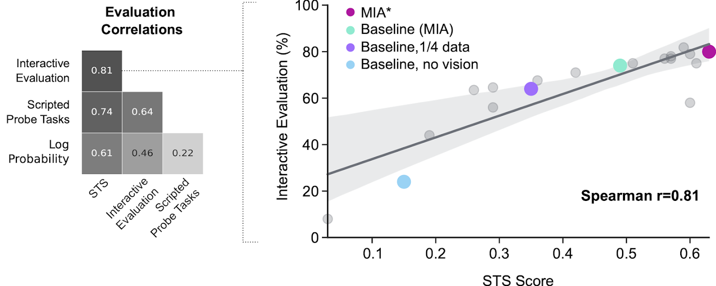Figure 2: STS evaluation compared to other evaluation metrics used for evaluating interactive agents. The STS correlates best with interactive evaluation compared to previous proxies used.