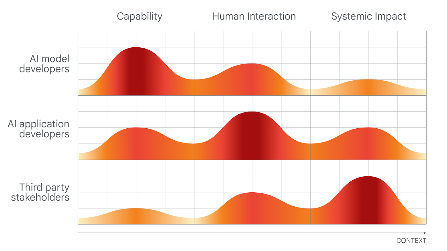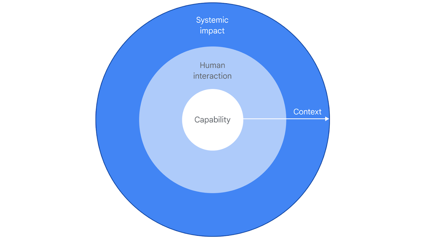 Our three-layered evaluation framework, including capability, human interaction, and systemic impact. Context is essential for assessing the safety of AI systems.