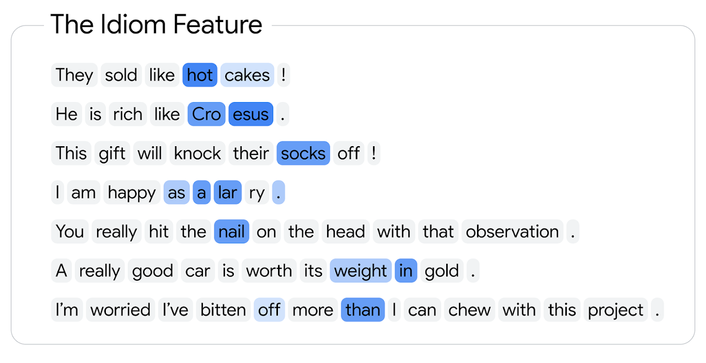 Example activations for a feature found by our sparse autoencoders. Each bubble is a token (word or word fragment), and the variable blue color illustrates how strongly the feature is present. In this case, the feature is apparently related to idioms.