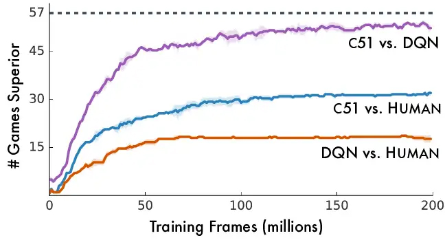 We took our new ideas and implemented them within the Deep Q-Network agent, replacing its single average reward output with a distribution with 51 possible values. The only other change was a new learning rule, reflecting the transition from Bellman’s (average) equation to its distributional counterpart. Incredibly, it turns out going from averages to distributions was all we needed to surpass the performance of all other comparable approaches, and by a wide margin. The graph below shows how we get 75% of a trained Deep Q-Network’s performance in 25% of the time, and achieve significantly better human performance: