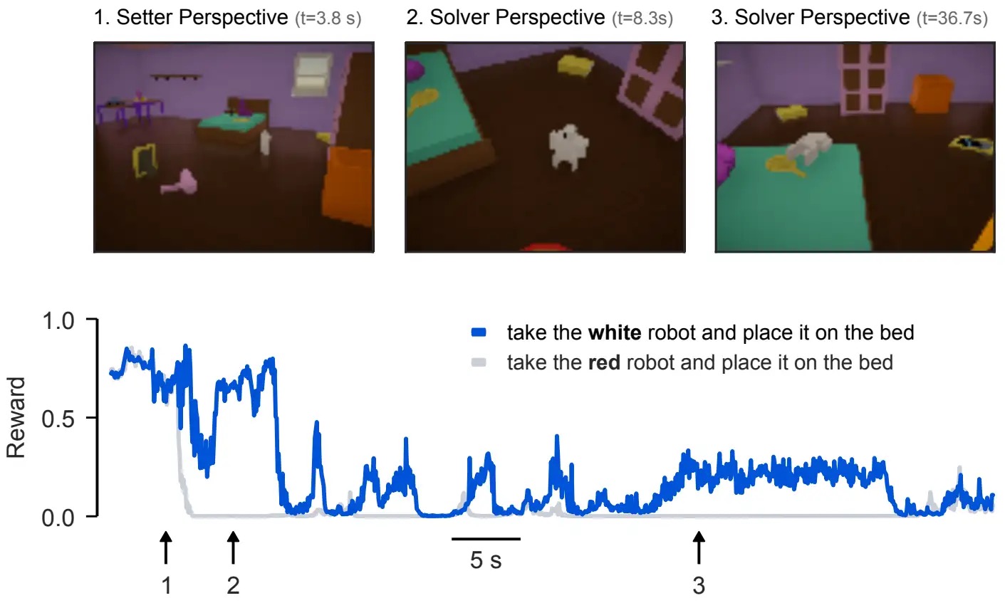 The setter agent asks the solver agent to “Take the white robot and place it on the bed.” The solver agent finds the robot and accomplishes the task. The reward function learned from demonstrations captures key aspects of the task (blue), and gives less reward (grey) when the same observations are coupled with the counterfactual instruction, “Take the red robot and place it on the bed.”