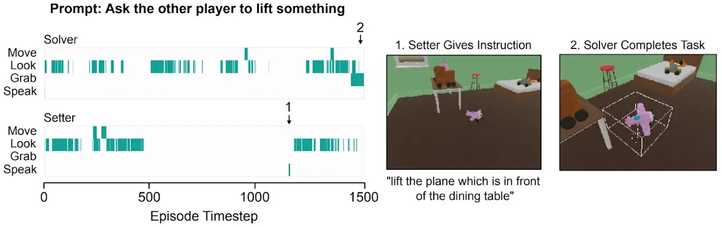 Left: Over the course of a 2 minute interaction, the two players (setter & solver) move around, look around, grab and drop objects, and speak. Right: The setter is prompted to “Ask the other player to lift something.” The setter instructs the solver agent to “Lift the plane which is in front of the dining table”. The solver agent finds the correct object and completes the task.