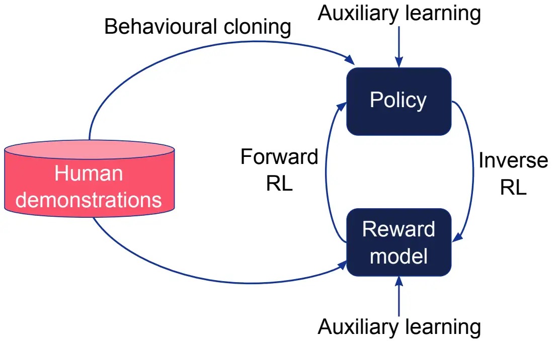 From human demonstrations we train policies using a combination of supervised learning (behavioural cloning), inverse RL to infer reward models, and forward RL to optimise policies using the inferred reward model. We use semi-supervised auxiliary tasks to help shape the representations of both the policy and reward models.