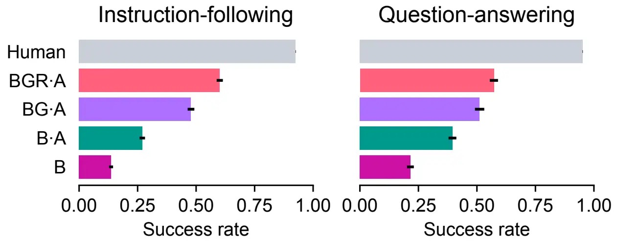 Humans evaluated the performance of agents and other humans in completing instructions in the Playroom on both instruction-following and question-answering tasks. Randomly initialised agents were successful ~0% of the time. An agent trained with supervised behavioural cloning alone (B) performed somewhat better, at ~10-20% of the time. Agents trained with semi-supervised auxiliary tasks as well (B·A) performed better. Those trained with supervised, semi-supervised, and reinforcement learning using interactive self-play were judged to perform best (BG·A & BGR·A).