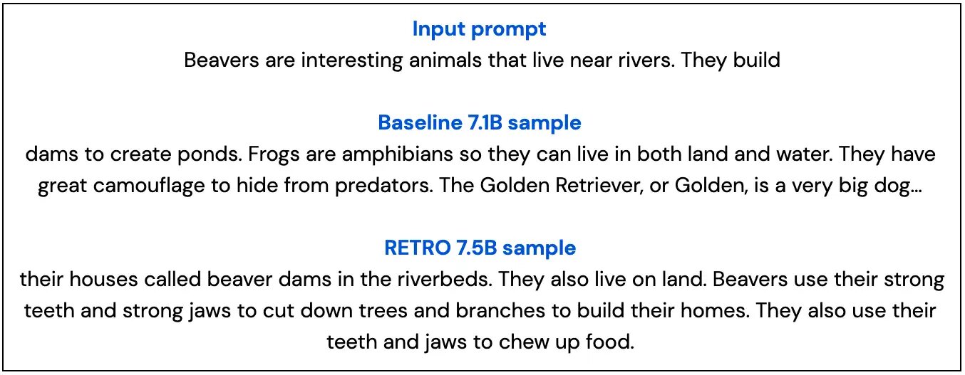 Below, we show two samples from our 7B baseline model and from our 7.5B RETRO model model that highlight how RETRO’s samples are more factual and stay more on topic than the baseline sample.