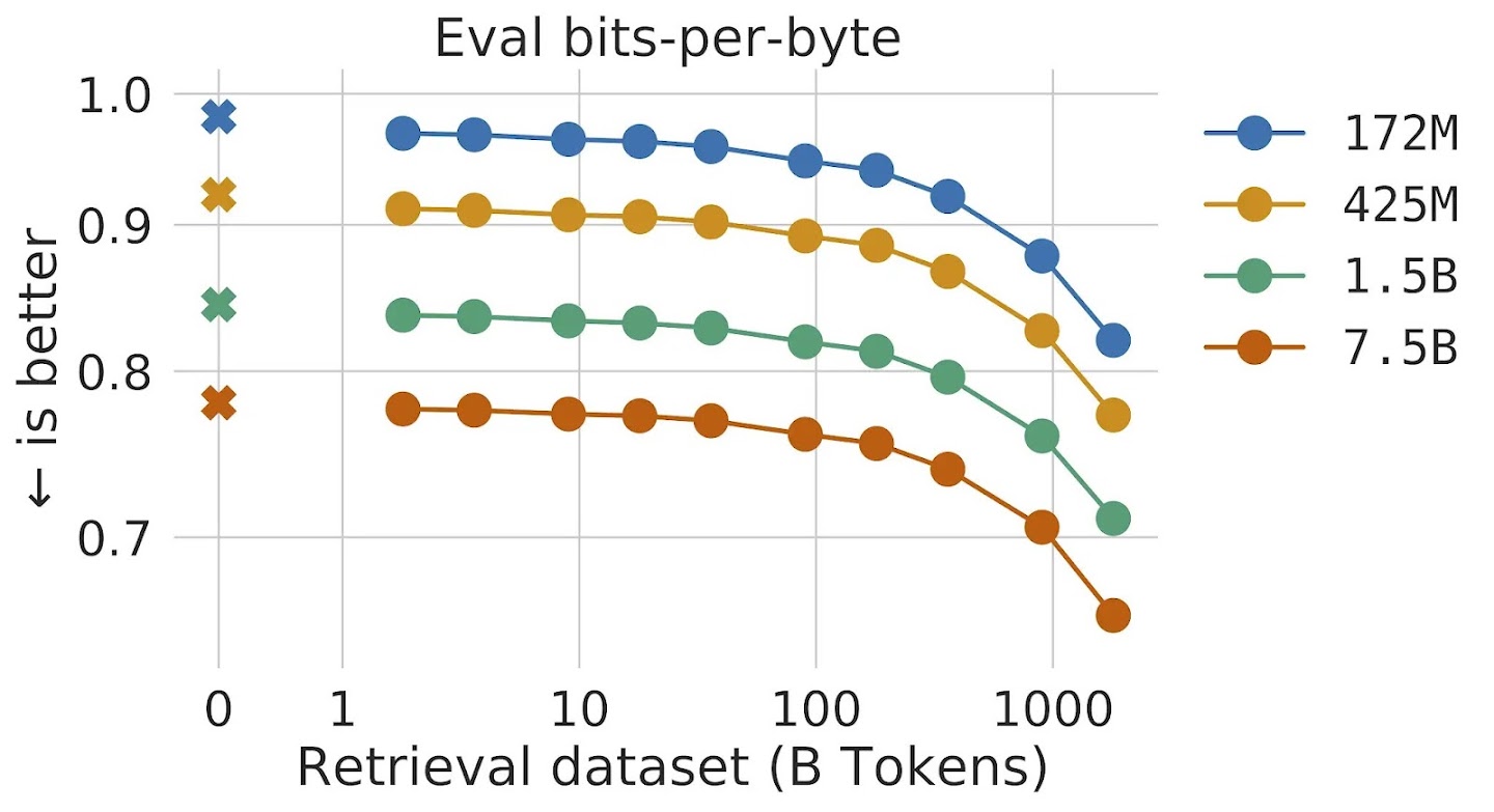 Figure 2: Increasing the size of the retrieval dataset results in large gains in model performance.