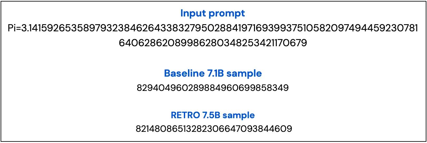 Figure 3: The baseline only generates 2 correct digits. With RETRO, the correct digits are generated after being retrieved by the database.