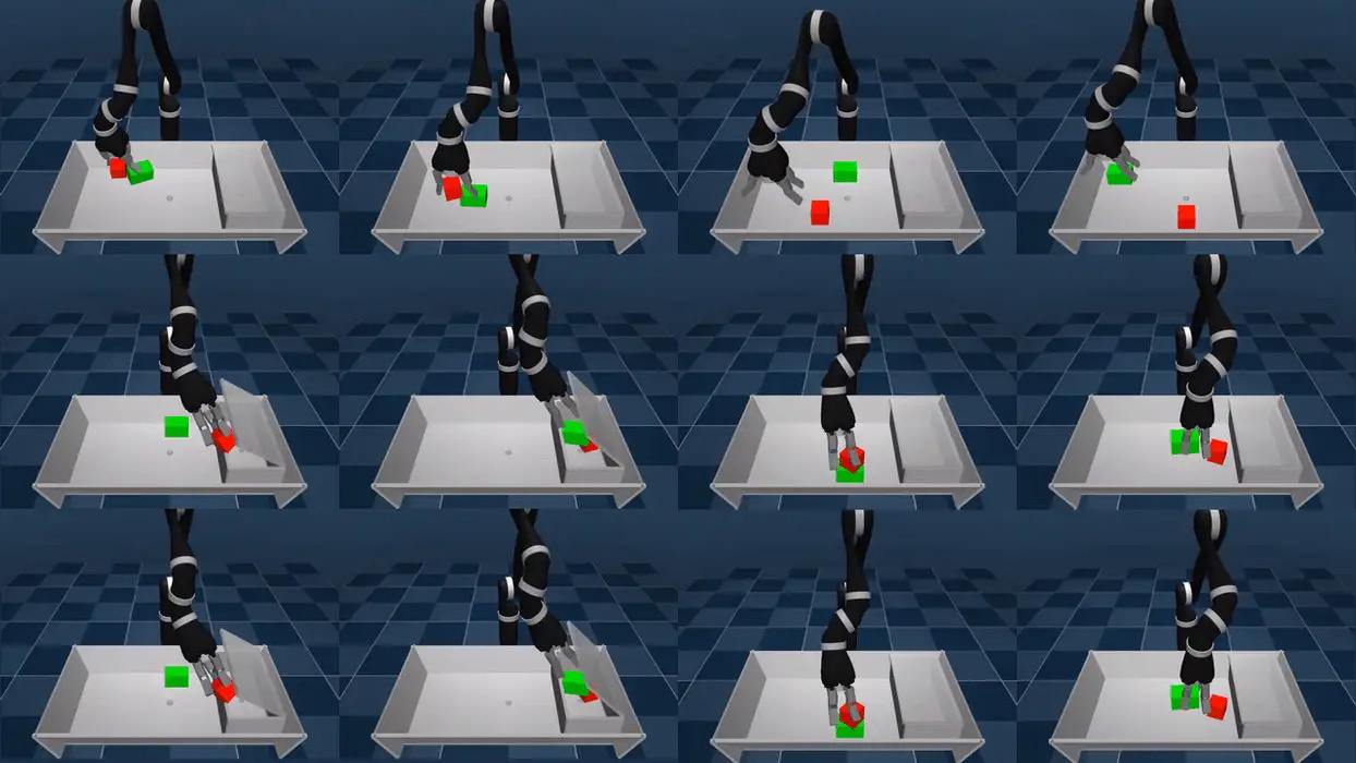 The simulated agent eventually masters the complex task of ‘stacking’ objects.