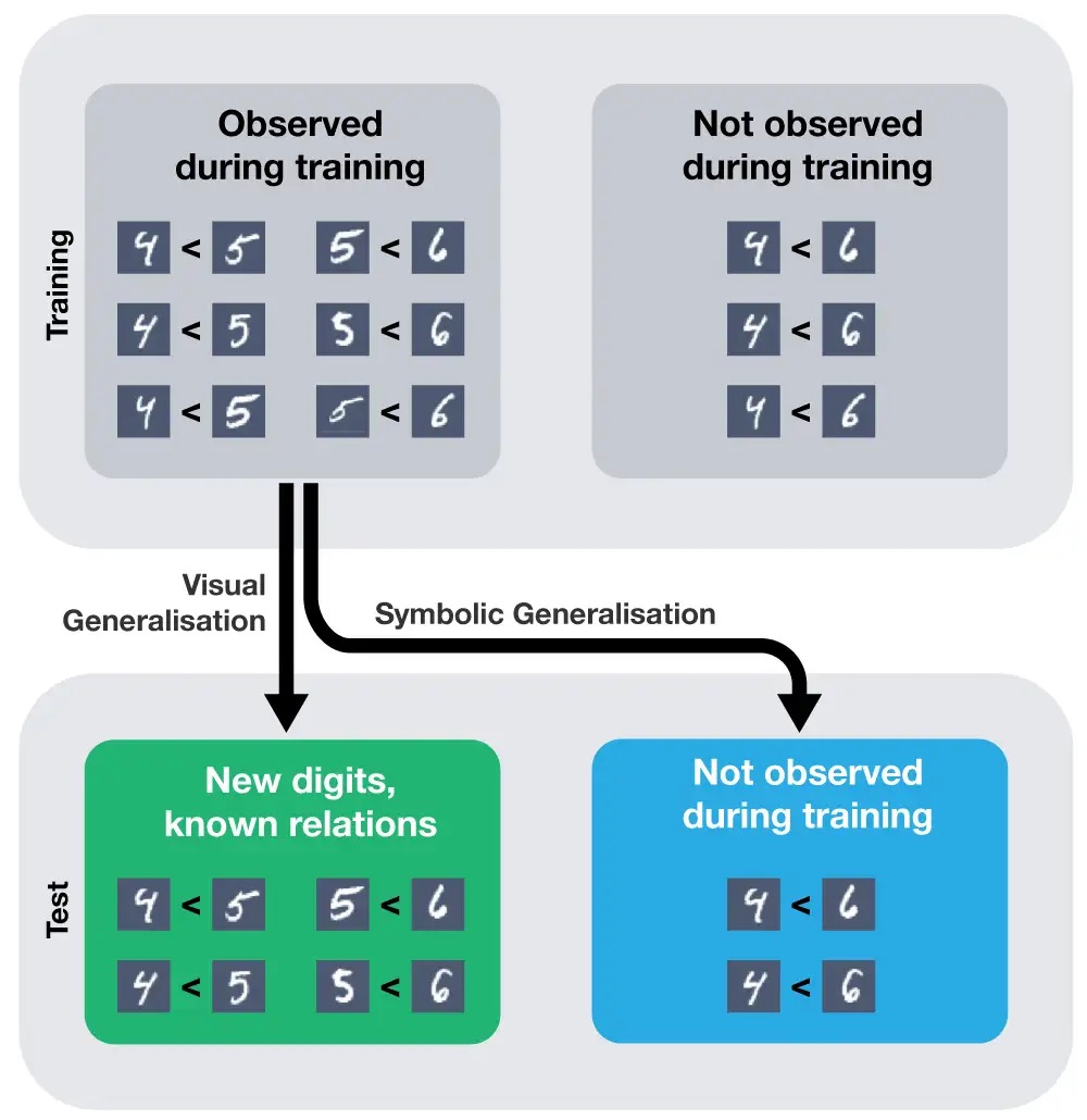 If you give a standard deep learning model (such as a convolutional neural network with an MLP) sufficient training data, it is able to learn to solve this task effectively. Once it has been trained, you can give it a new pair of images it has never seen before, and it will classify correctly. However, it will only generalise correctly if you give it multiple examples of every pair of digits. The model is good at visual generalisation: generalising to new images, assuming it has seen every pair of digits in the test set (see the green box below). But it is not capable of symbolic generalisation: generalising to a new pair of digits it has not seen before (see the blue box below). Researchers like Gary Marcus and Joel Grus have pointed this out in recent, thought-provoking articles.