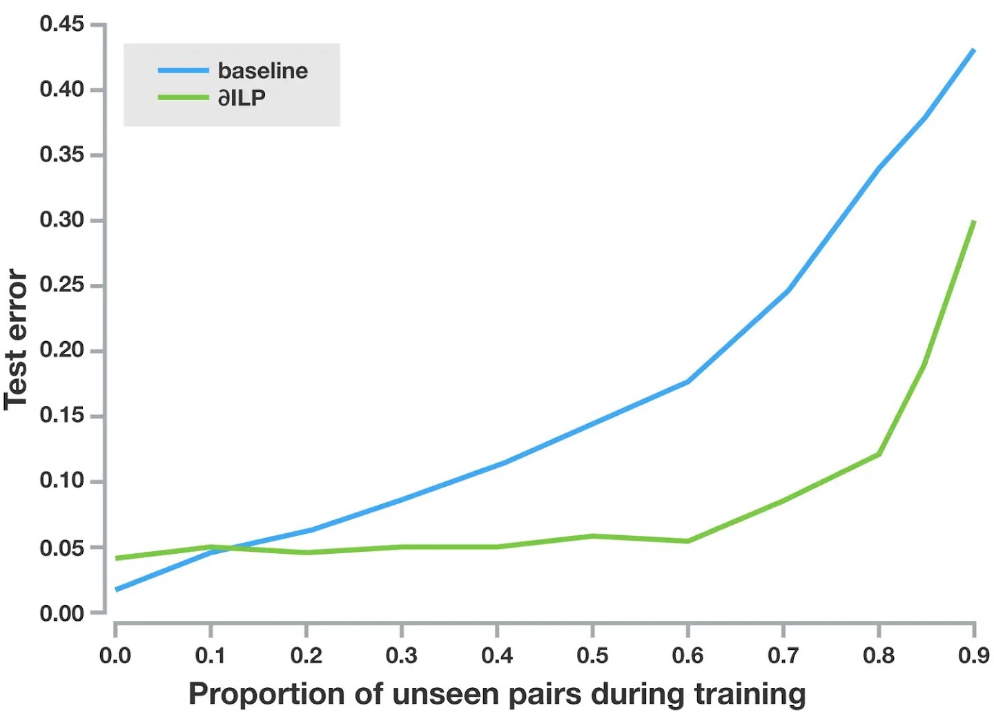 Our less-than experiment is summarised above: the standard deep neural network (the blue curve) is unable to generalise correctly to unseen pairs of digits. By contrast, ∂ILP (the green line) is still able to achieve a low test error when it has only seen 40% of the pairs of digits; this shows it is capable of symbolic generalisation.