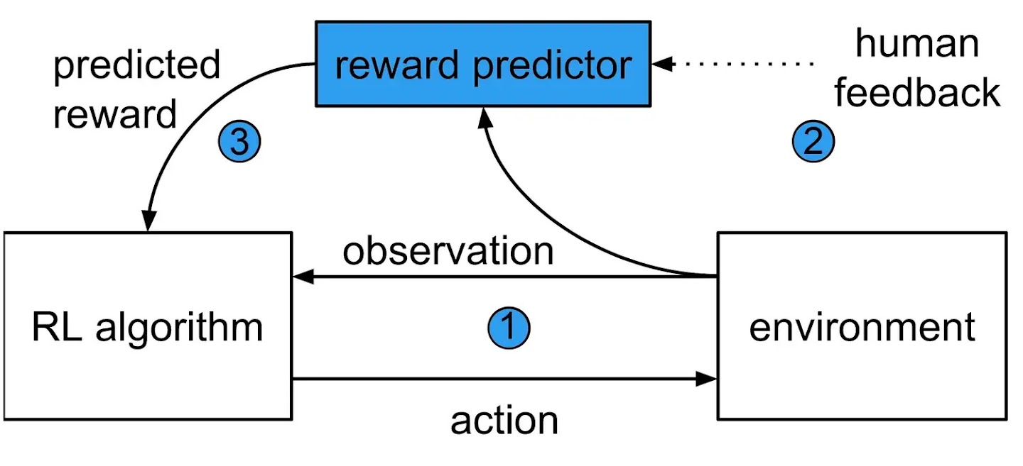 3. The human’s choice is used to train a reward predictor, which in turn trains the agent. Over time, the agent learns to maximise the reward from the predictor and improve its behaviour in line with the human’s preferences.