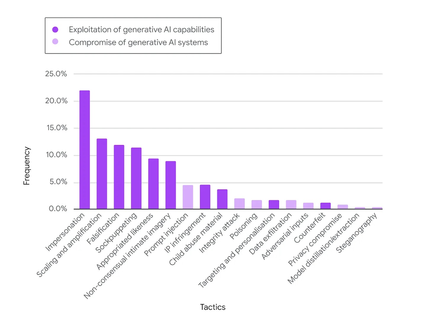 Relative frequency generative AI misuse tactics in our dataset. Any given case of misuse reported in the media could involve one or more tactics.