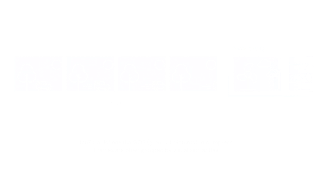 A visualization demonstrating how MuZero compresses video files. It defines groups of pictures with visual similarities for compression. A single keyframe is compressed. MuZero then compresses other frames, using the keyframe as a reference. The process repeats for the rest of the video, until compression is complete.