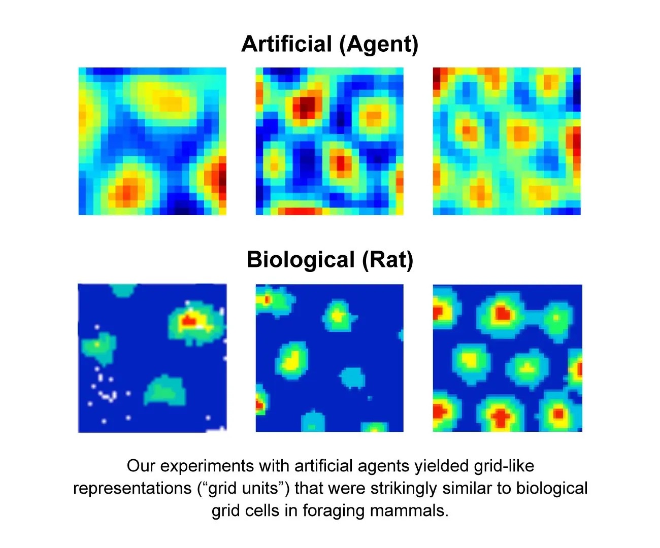 Our experiments with artificial agents yielded grid-like representations (“grid units”) that were strikingly similar to biological grid cells in foraging mammals.