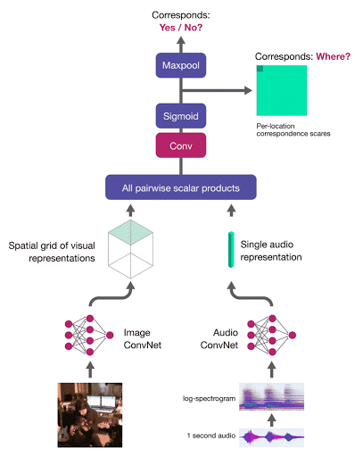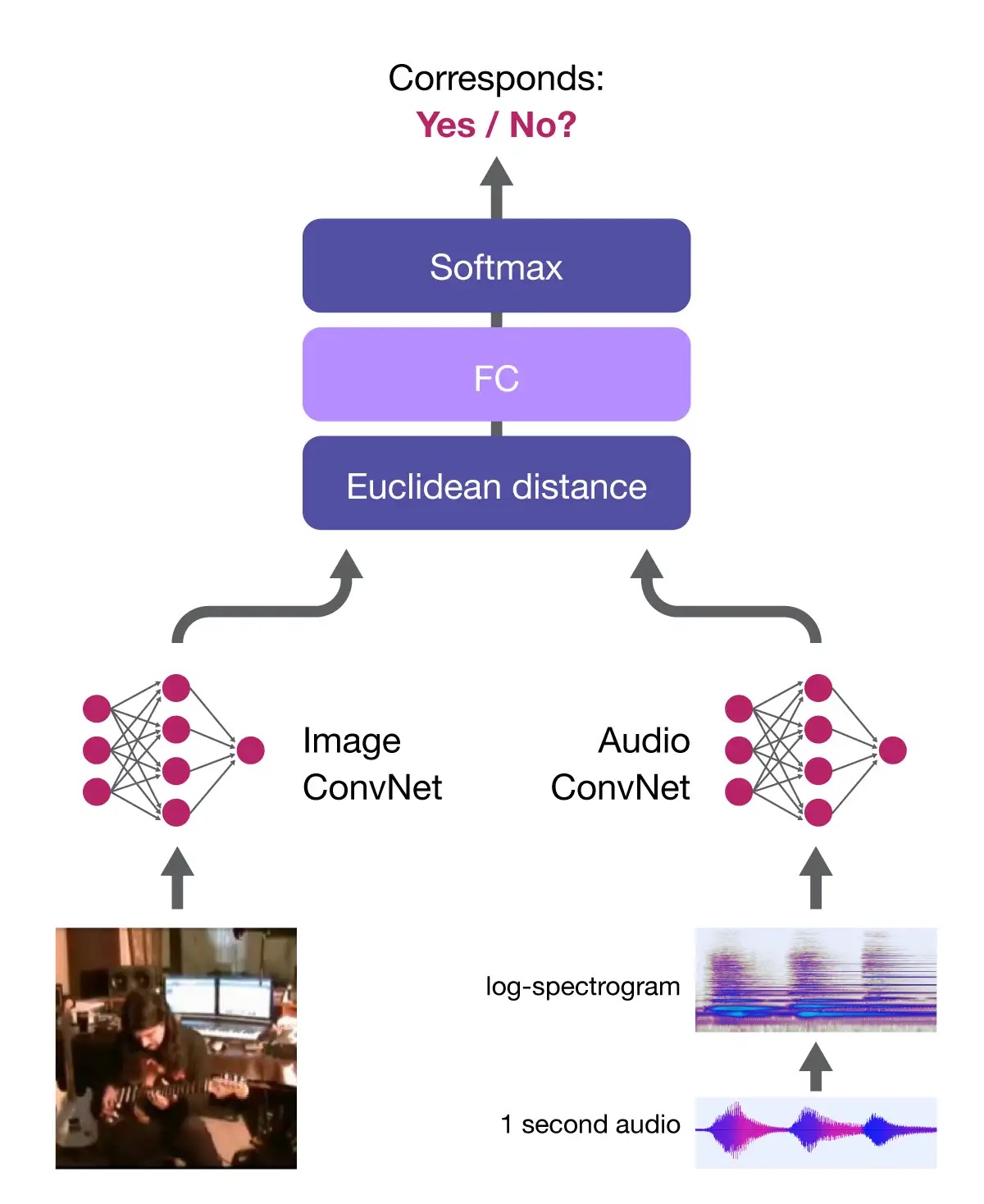The image and the audio subnetworks extract visual and audio embeddings and the correspondence score is computed as a function of the distance between the two embeddings. If the embeddings are similar, the (image, audio) are deemed to correspond.