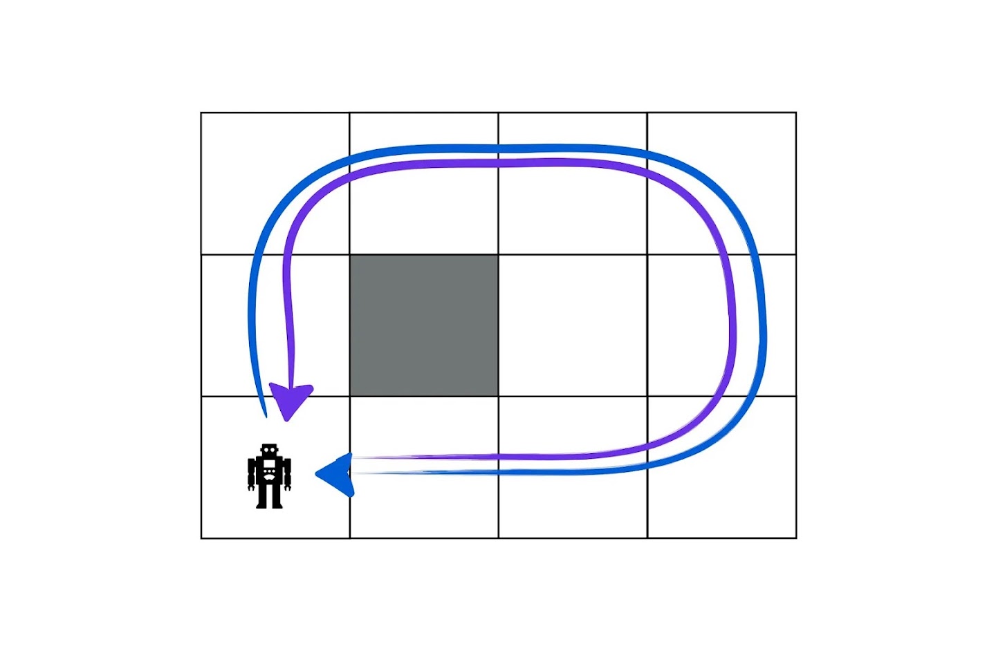 This task is naturally captured by a SOAP that consists of two acceptable policies: the “clockwise” policy (in blue) and the “counterclockwise” policy (in purple). For a Markov reward function to express this task, it would need to make these two policies strictly higher in value than all other deterministic policies. However, there is no such Markov reward function: the optimality of a single “move clockwise” action will depend on whether the agent was already moving in that direction in the past. Since the reward function must be Markov, it cannot convey this kind of information. Similar examples demonstrate that Markov reward cannot capture every policy order and trajectory order, too.