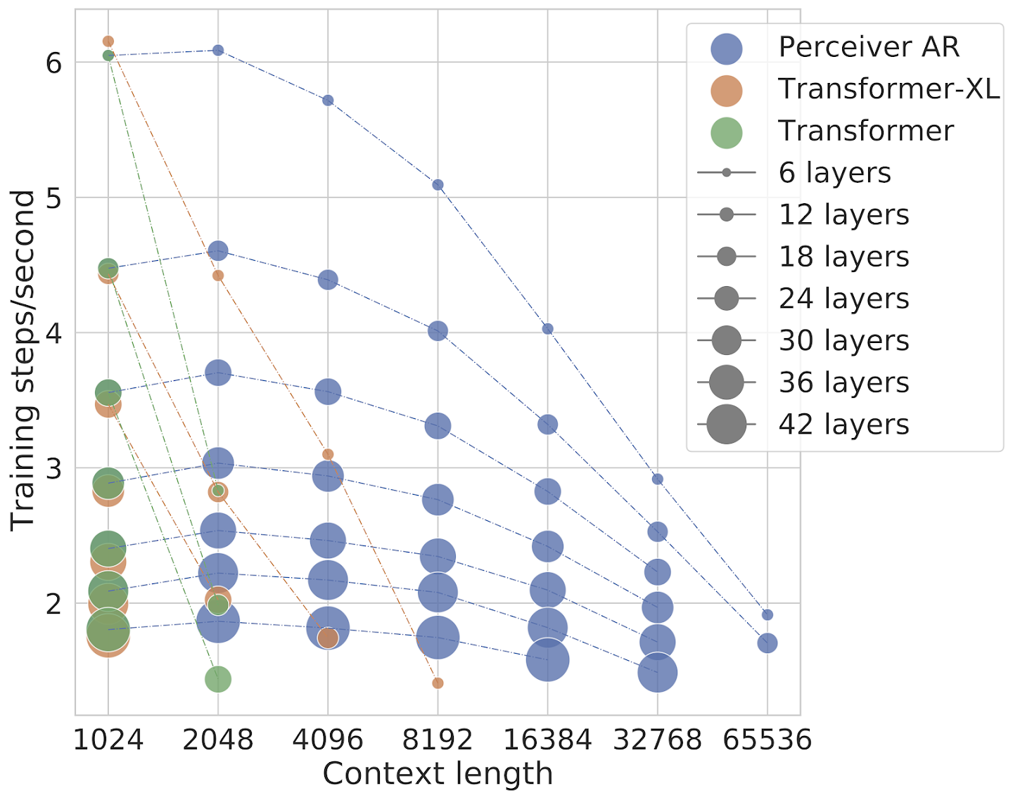As context length or model size increases, the amount of compute needed to train a model grows. We can quantify the compute budget for different models by measuring their speed on real hardware (steps per second on TPUv3), as the input context length and model size increase. Unlike other generative models like Transformer or Transformer-XL, Perceiver AR decouples input context length from model depth, allowing us to easily deploy the deep models needed to model long sequences on current-generation TPUs or GPUs.