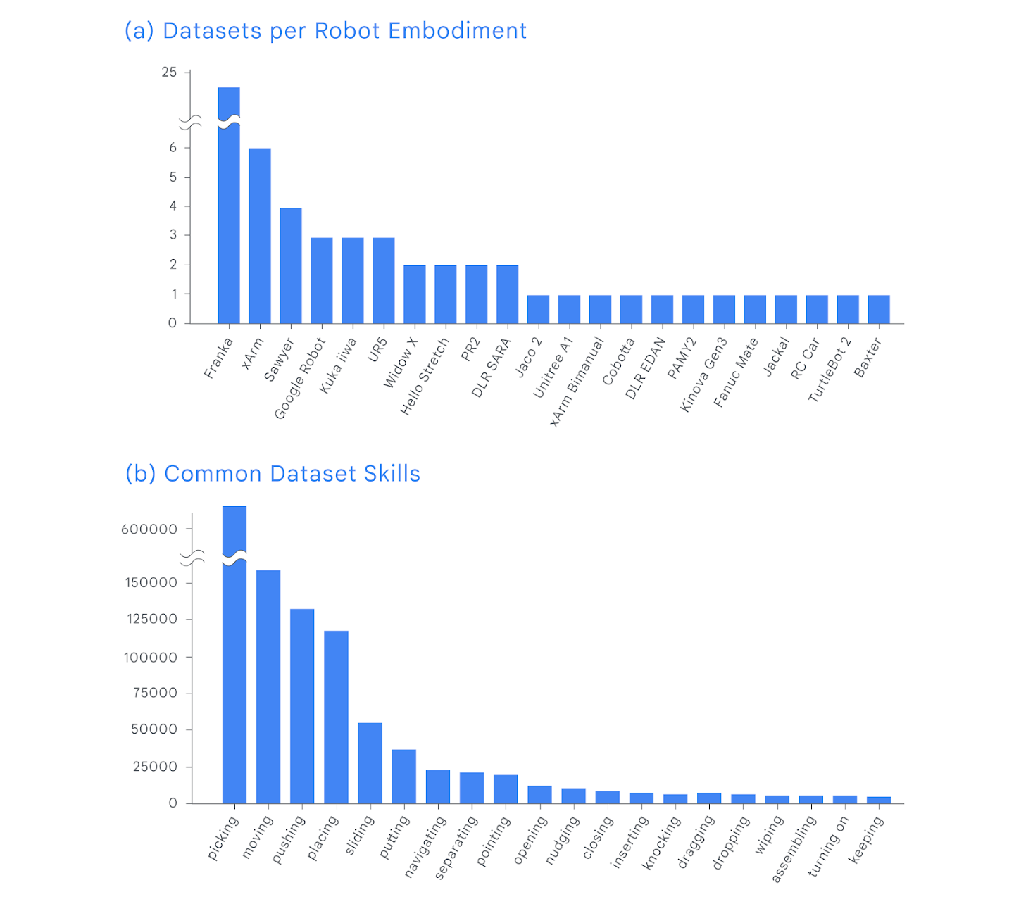 The Open X-Embodiment dataset combines data across embodiments, datasets and skills.