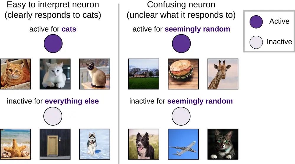 Neurons with clear response patterns (e.g., active for cats, inactive for everything else) are much more interpretable than confusing neurons which are active and inactive in response to seemingly random sets of images.