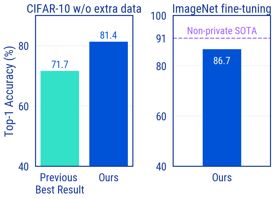 The figure below summarises two of our main results: an ~10% improvement on CIFAR-10 compared to previous work when privately training without additional data, and a top-1 accuracy of 86.7% on ImageNet when privately fine-tuning a model pre-trained on a different dataset, almost closing the gap with the best non-private performance.