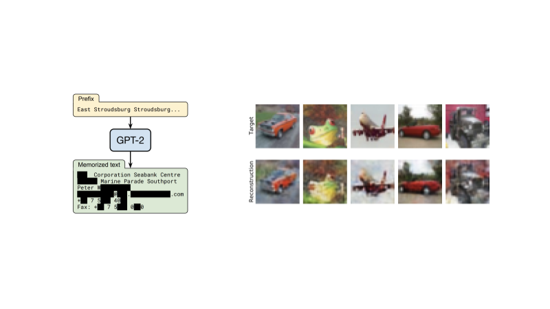 Figure 1: (left) Illustration of training data leakage in GPT-2 [credit: Carlini et al. "Extracting Training Data from Large Language Models", 2021]. (right) CIFAR-10 training examples reconstructed from a 100K parameter convolutional neural network [credit: Balle et al. "Reconstructing Training Data with Informed Adversaries", 2022]