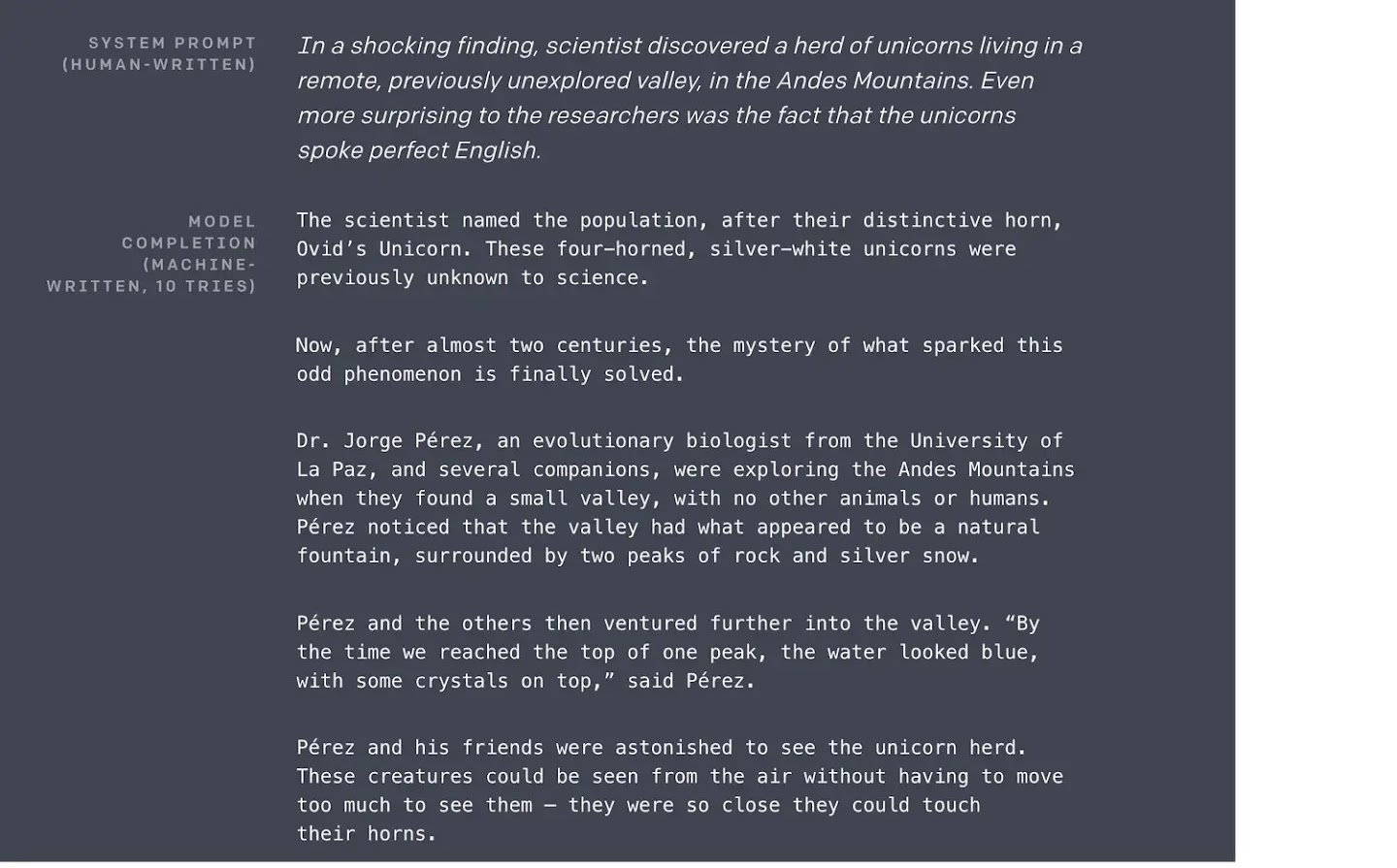 One interesting inconsistency in the text is that the unicorns are described as “four-horned”: again, it is fascinating to probe the limitations of the network’s understanding.
