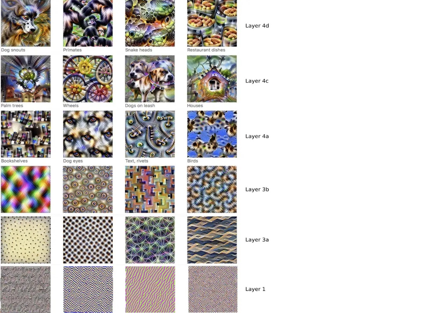 The visual vocabulary of a convolutional neural network. For each layer of the network, images are generated that maximally activate particular neurons. The response of these neurons to other images can then be interpreted as the presence of absence of visual “words”: textures, bookshelves, dog snouts, birds. From Feature Visualization, Olah et al. (2017).