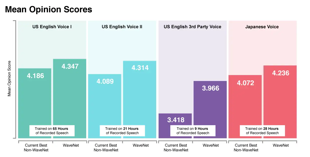 But over the last 12 months we have worked hard to significantly improve both the speed and quality of our model and today we are proud to announce that an updated version of WaveNet is being used to generate the Google Assistant voices for US English and Japanese across all platforms.