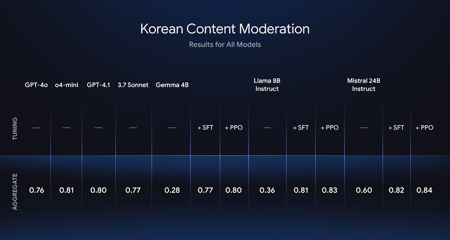 Effective content moderation in Korean demands an understanding of cultural nuance where standard APIs fail. We were impressed that by using advanced reinforcement learning, a small, open 4B model could achieve precision that outperforms even large proprietary systems in both Korean and English. This provides a highly accurate, low-latency solution, giving us greater strategic control while keeping our customer data secure.