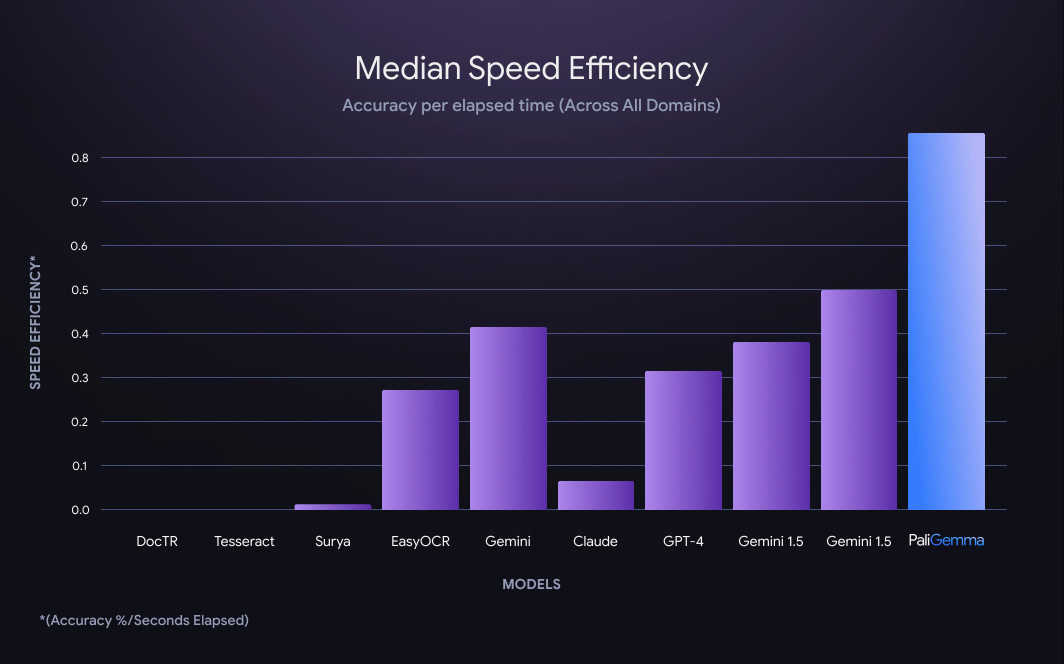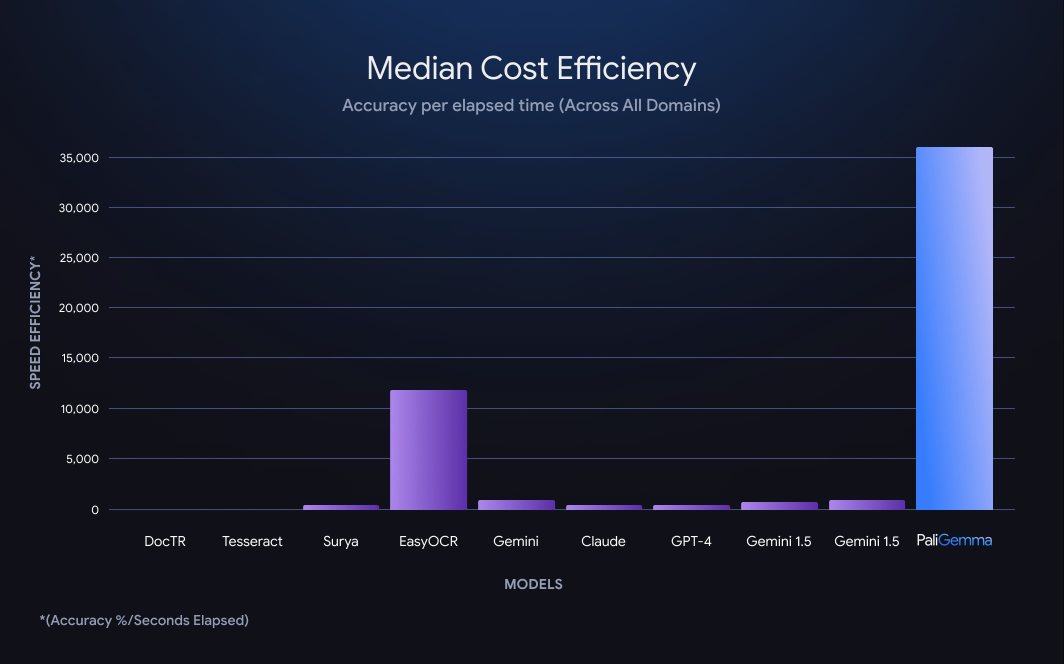 PaliGemma ranks as both the fastest and most cost-efficient model in Roboflow’s optical character recognition testing.