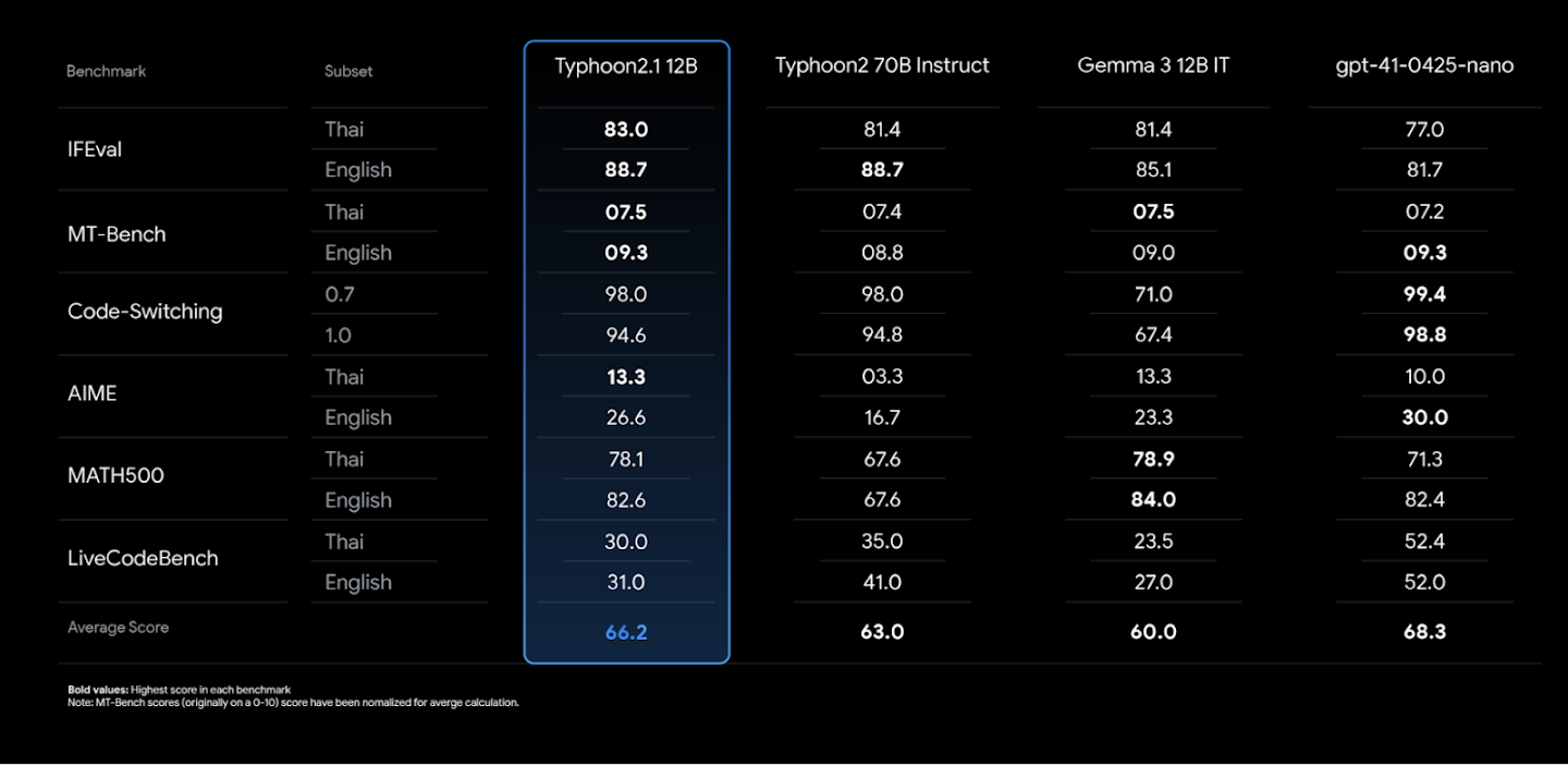What sets Typhoon 2.1 Gemma apart is its balance of strong performance and lightweight cost-efficiency, making deployment practical in both enterprise and consumer environments.